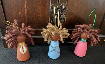 My name is Jada, and I am the artisan who creates every Ethnic Angel. I started making Ethnic Angels over 25 years ago, because everywhere I searched, and believe me, I searched, I could never find an Angel of color to hang on my Christmas Tree. One day, I decided to start creating my own Ethnic Angels. I wasn't sure what materials I would use, so I just started experimenting with everything from cardboard to pine cones. Here's a peek at some of my earlier creations.